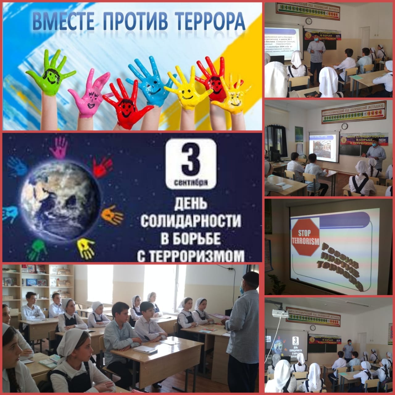 Педагог-организатор по ДНВиР Джением М.М. провел беседу среди обучающихся 7-х классов на тему: "Вместе против террора", приуроченный ко Дню солидарности в борьбе с терроризмом.