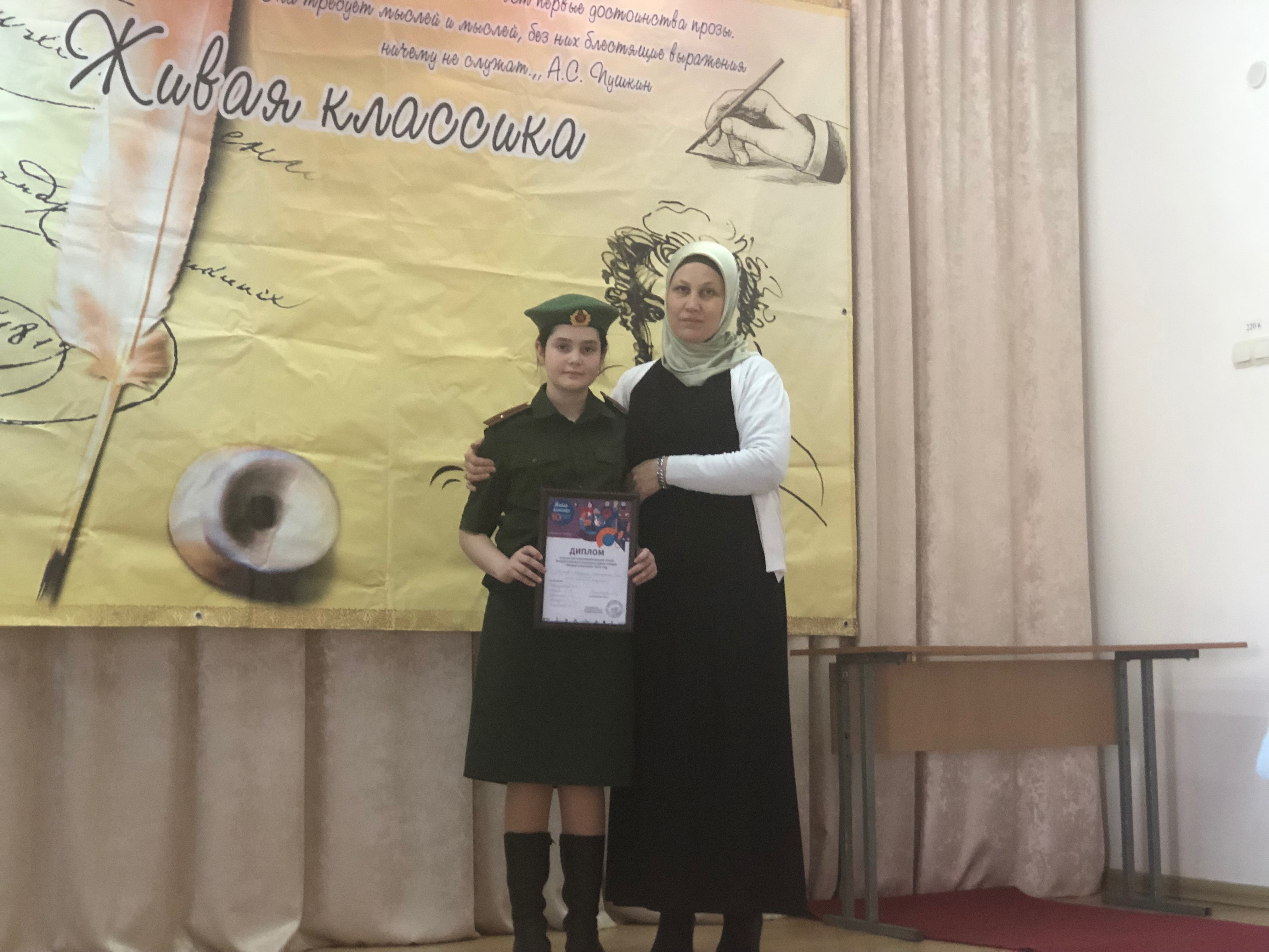 04.03.2021Обучающаяся 5 «А» класса МБОУ « СОШ №1 с.п. Гвардейское» Евлоева Хадиджа заняла 3-е место на муниципальном этапе конкурса чтецов «Живая классика», проходившего 4 марта в МБОУ «СОШ № 2 с.п. Верхний-Наур"