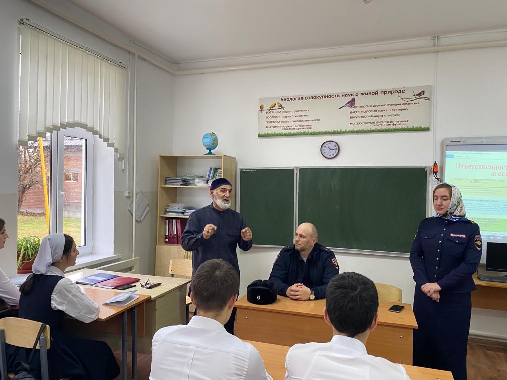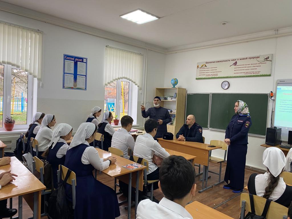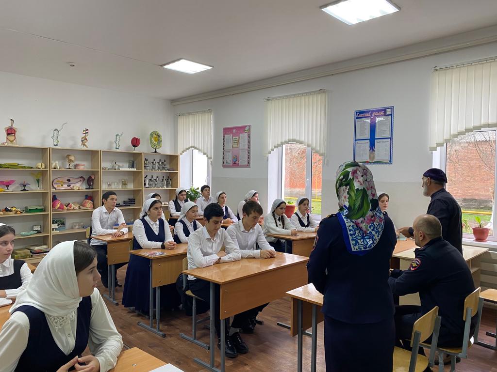 в МБОУ «СОШ №1 с.п.Гвардейское» проведена профилактическая беседа с обучающимися 9-х классов совместно со старшим инспектором ОПДН ОУУП и ПДН старшим лейтенантом Сельмурзаевой Х.А. и инспектором ОПДН младшим лейтенантом Идрисовым М.С.