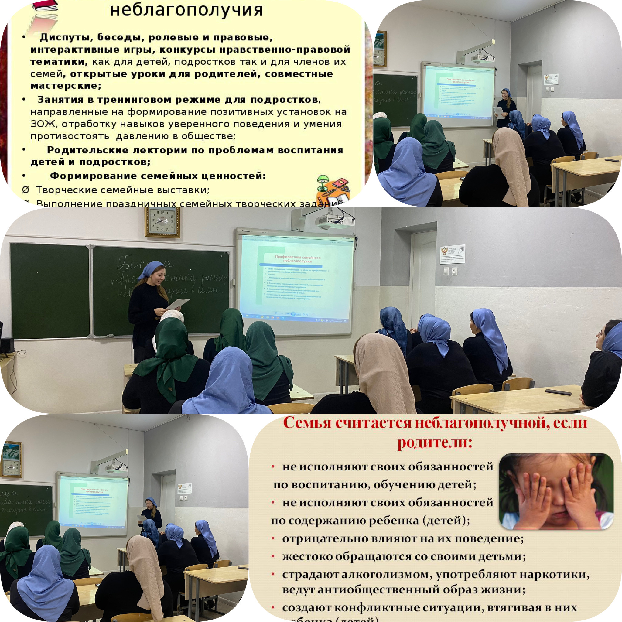 27.01.202427.01. социальным педагогом Ибрагимовой Х.Н. была проведена беседа с классными руководителями на тему: «Профилактика раннего неблагополучия в семье».